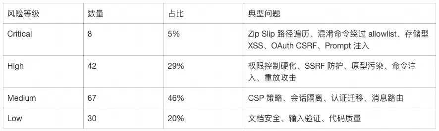 Critical 与 High 合计 50 个,约占明确安全修复的 34%。按代码模块分布,风险高度集中在入口与执行层: