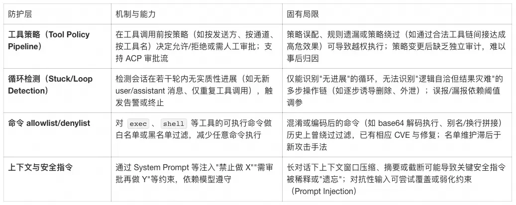 OpenClaw 在架构上提供了多道预防性控制(Preventive Controls):工具策略管道(Tool Policy Pipeline)在调用前做策略决策、Owner-only 封装对敏感操作做权限绑定、循环检测器识别无进展的会话、命令 allowlist/denylist 限制可执行命令集合。这些机制在正常配置下能有效缩小攻击面,但从安全工程角度看,它们属于同一信任域内的执行时校验,存在以下固有局限: