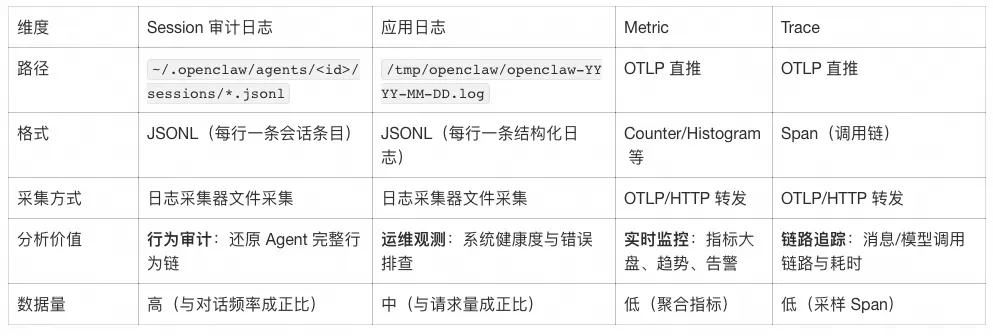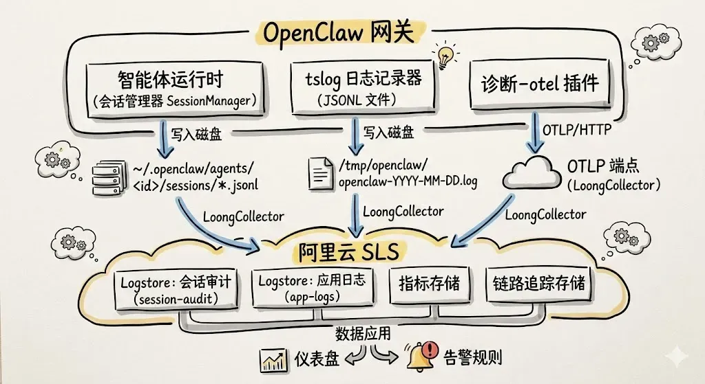 OpenClaw Gateway 内部存在三个独立的数据生产者:SessionManager 将每轮对话的完整结构化数据写入磁盘 JSONL 文件;tslog Logger 写应用运行日志;diagnostics-otel 插件通过 OTLP/HTTP 协议直接将 Metrics 与 Traces 推送到 OTLP 兼容后端。前两者通过日志采集器(如 LoongCollector、Filebeat、Fluentd 等)文件采集后转发到日志分析平台,后者直接对接任意支持 OTLP 协议的可观测后端。
