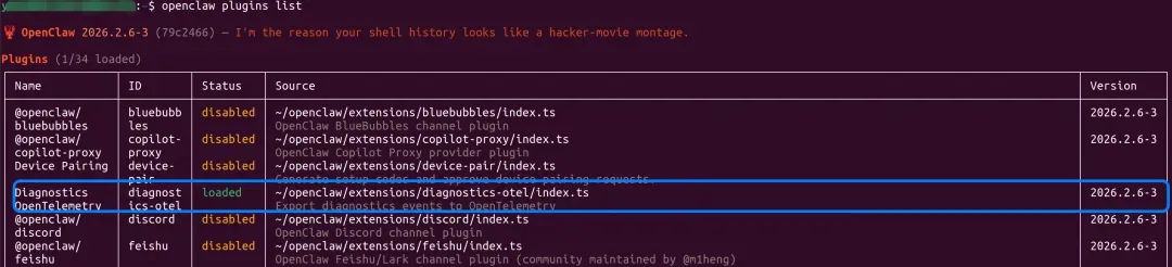 执行命令 openclaw plugins enable diagnostics-otel启动插件,通过 openclaw plugins list 命令查看插件状态,预期状态为 loaded。