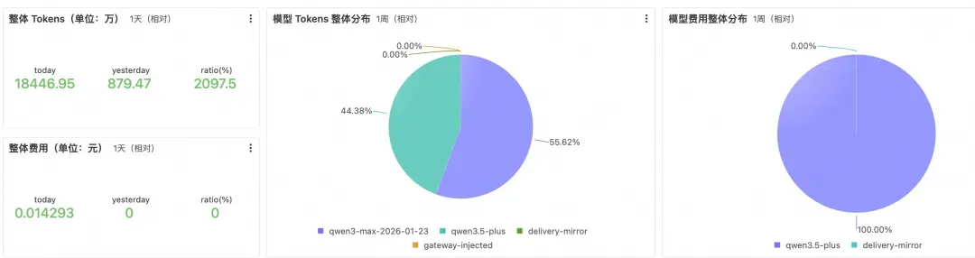 - 整体概览:今日 vs 昨日的 Token 与费用环比,日环比突破阈值(如 ±30%)是成本异常的第一道信号;