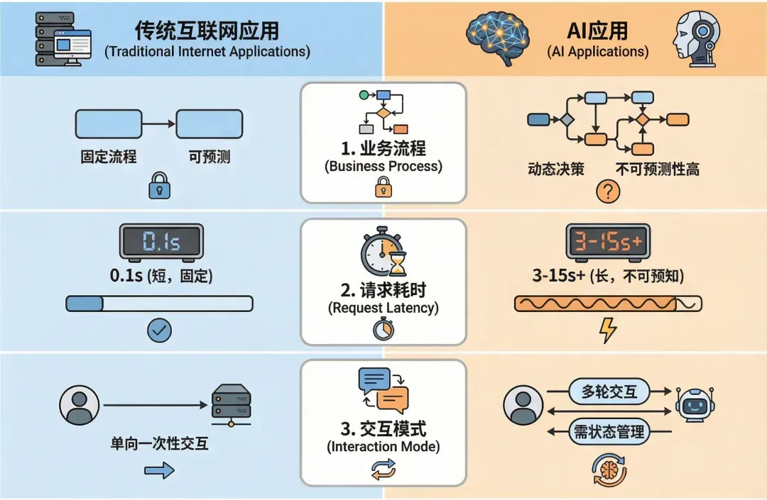 AI 应用与传统互联网应用存在本质差异,在于其执行模式和任务耗时。传统应用流程固定可预测、耗时短(秒级)、多为单向一次性交互;AI 应用更偏主动执行,会自主拆解目标并动态调整策略,流程不确定,单次任务耗时长(分钟级且不可预测),还常伴随多轮对话交互。