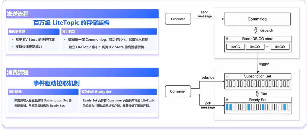 - 统一存储、多路分发:所有消息数据统一存储在底层 CommitLog 文件中且仅存储一份,采用追加写入模式避免磁盘碎片化,保障极致写入性能。同时,通过多路分发机制为不同 LiteTopic 生成独立的消费索引。