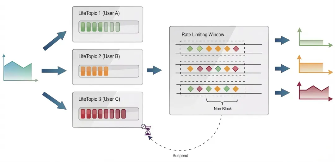 - 精准流控:每个 LiteTopic 可独立执行限流策略,支持按用户配置差异化阈值,真正实现“千人千面”的个性化流量治理。