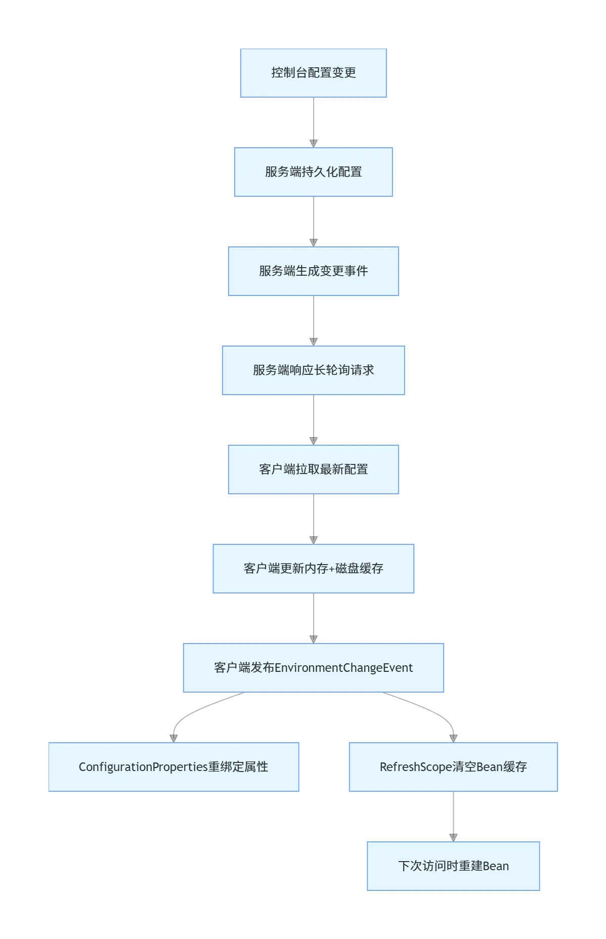 EnvironmentChangeEvent事件时,RefreshScope会监听该事件,清空内部持有的Bean实例缓存,销毁原实例 - 下次调用代理对象的方法时,会重新创建Bean实例,注入最新的配置属性,完成刷新