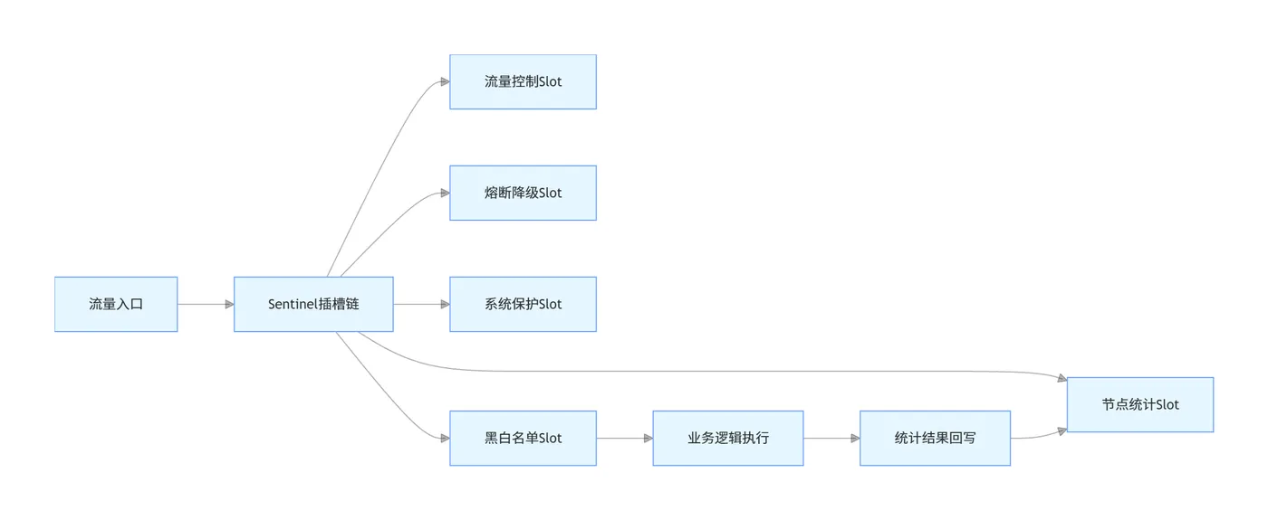 Sentinel采用责任链模式的插槽链(Slot Chain)核心架构,每个插槽负责一个独立的功能模块,可灵活扩展,所有规则执行都基于实时统计数据。