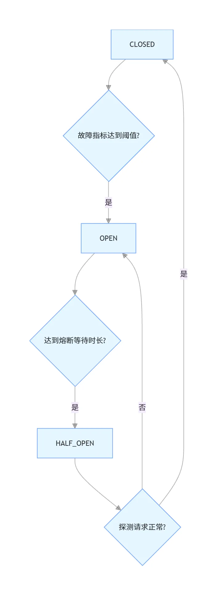 • HALF_OPEN半开状态:断路器打开达到设定时长后,进入半开状态,放行少量探测请求,验证下游服务是否恢复。若探测请求正常,断路器关闭;若仍有故障,重新回到打开状态。