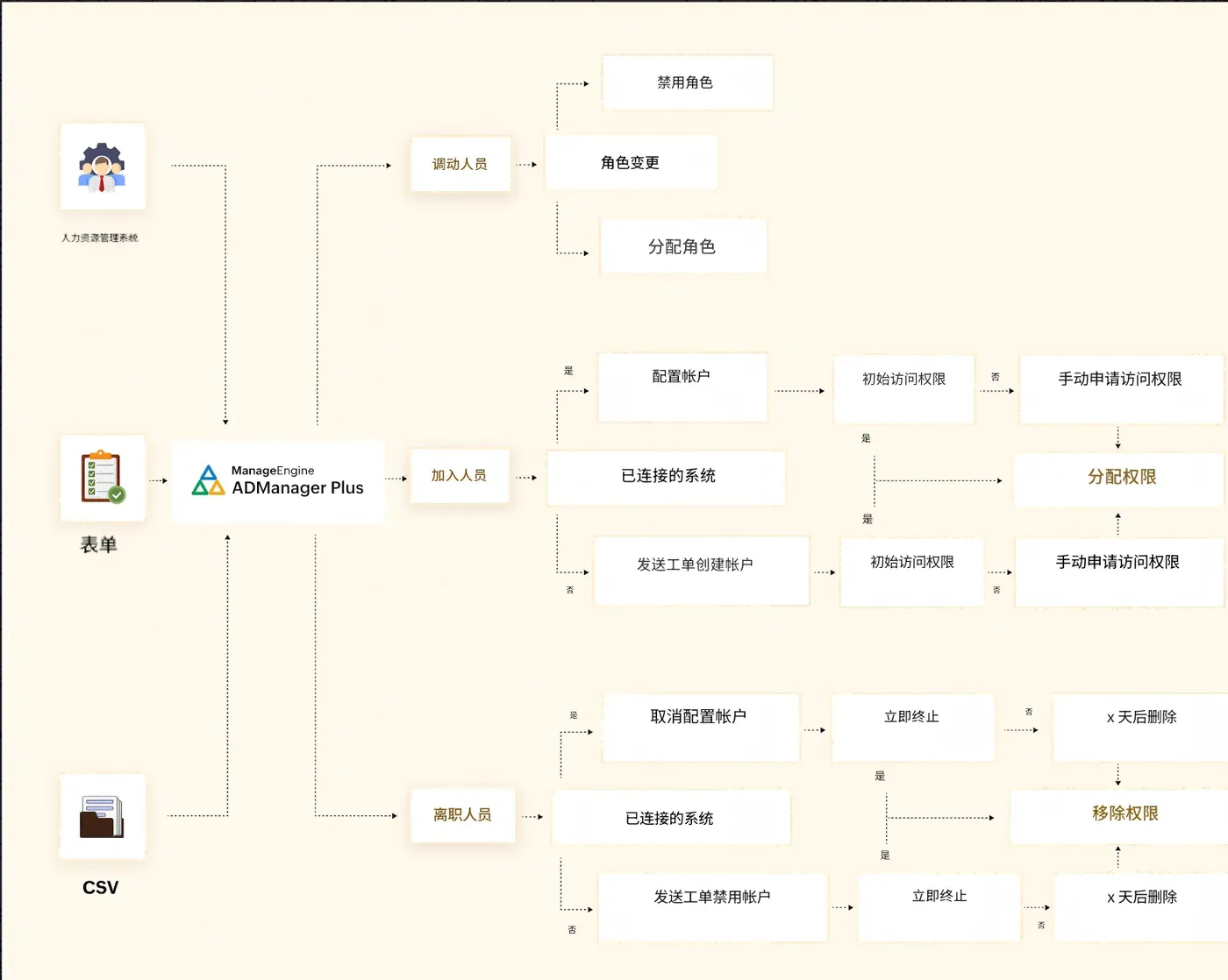 初始访问权限贯穿用户身份生命周期的全流程,实现 “权限随人动” 的自动化管理: