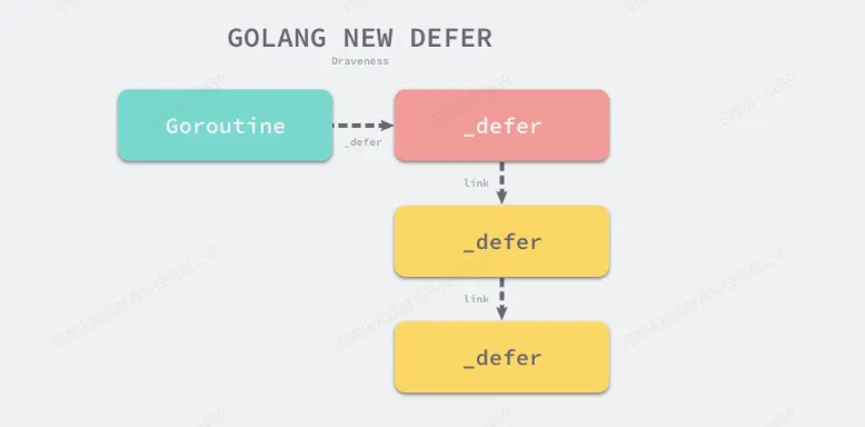 - 多个 defer 通过 link 字段形成一个单链表(LIFO 栈),挂载到当前 goroutine 的结构上(g._defer)。新的 defer 总是插入链表头部。