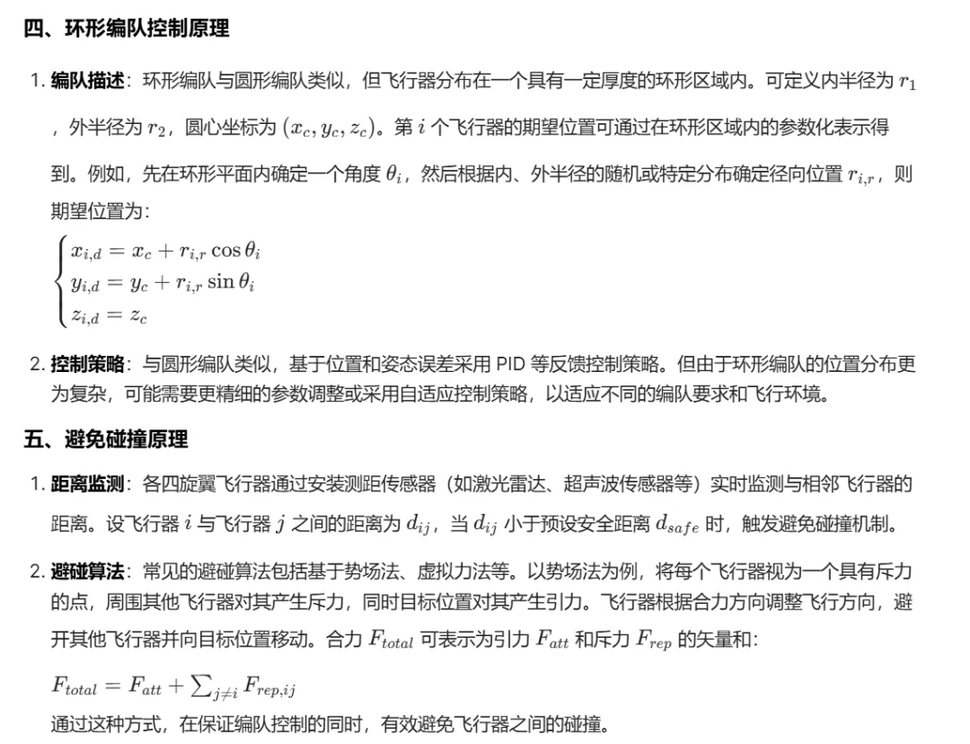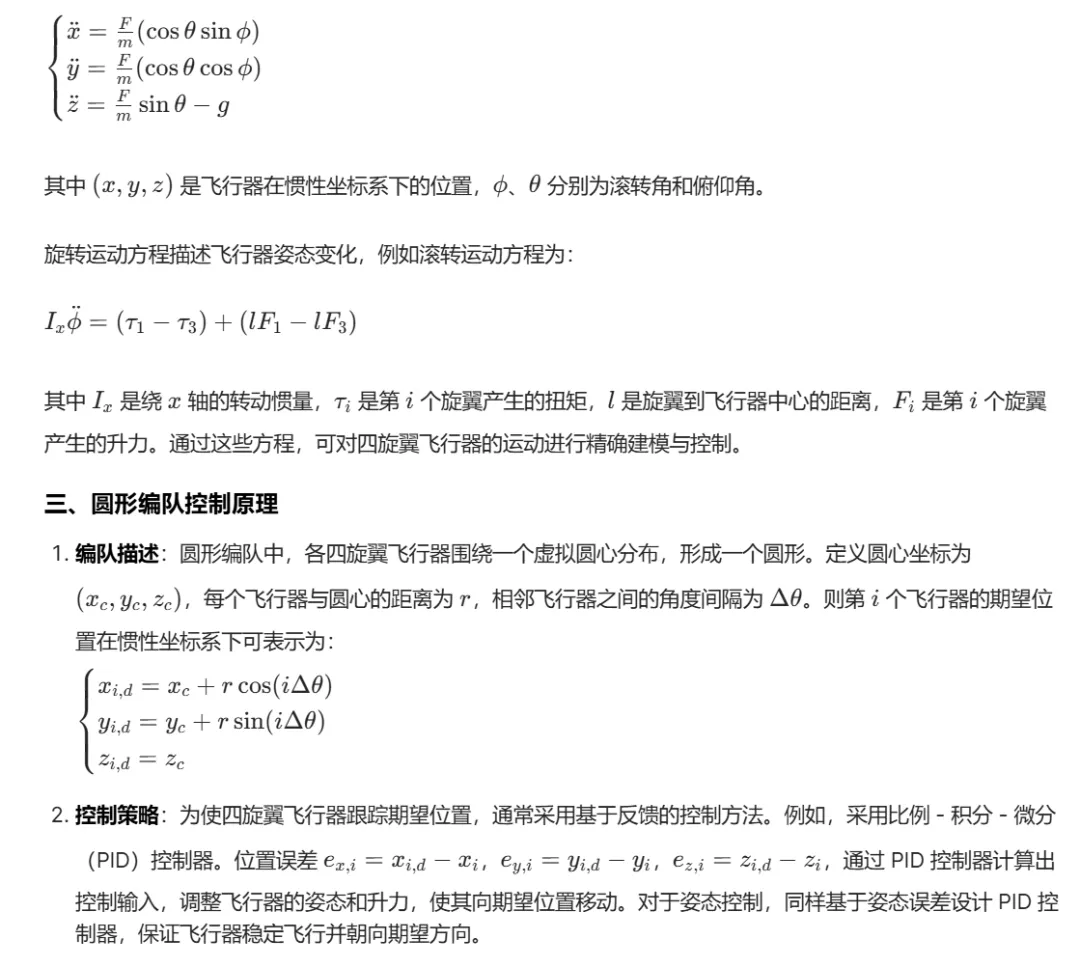 在多四旋翼飞行器协同作业场景中,如空中表演、搜索救援、环境监测等,编队控制至关重要。圆形和环形编队能够提供特定的覆盖范围、信息采集模式或展示效果。然而,四旋翼飞行器在空间中运动时,由于其动力学特性复杂,且编队中各飞行器之间距离较近,容易发生碰撞。因此,实现精确的编队控制并避免碰撞,对于提高多四旋翼系统的可靠性和实用性具有重要意义。