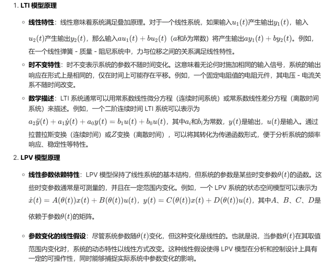 - 自适应与鲁棒控制需求:为了实现对这些参数变化系统的有效控制,需要一种能够反映系统参数变化的模型。LPV 模型应运而生,它允许系统的动态特性随特定参数的变化而线性改变,为自适应控制和鲁棒控制的设计提供了更精确的模型基础,有助于提高控制系统在不同工况下的性能和稳定性。