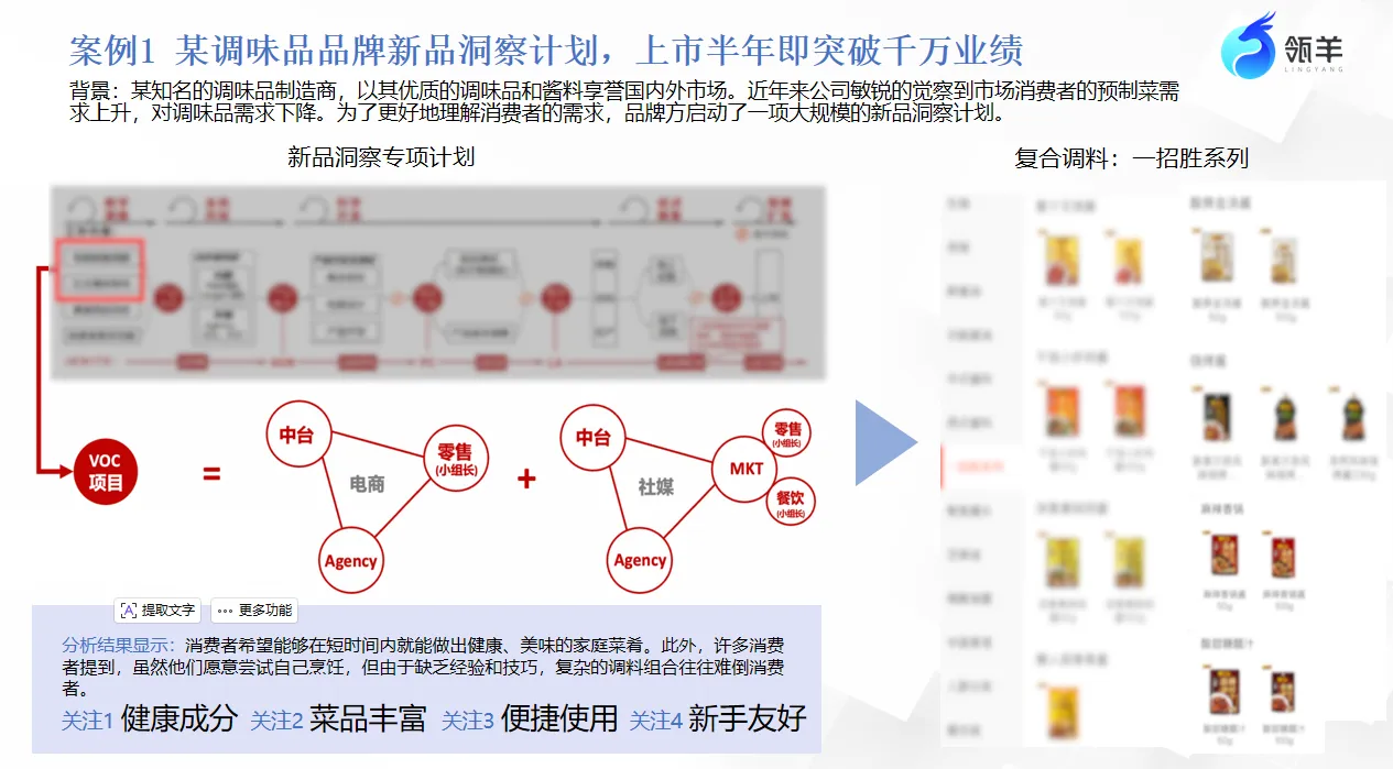 瓴羊Agent One的价值已在多个行业的实践中得到验证。例如,某调味品品牌通过系统洞察到用户对“健康、便捷、新手友好”的复合调料需求,迅速推出新品并实现业绩增长;某服饰品牌则通过分析负面评价,精准定位到“缩水”、“异味”等面料痛点,针对性改进水洗工艺,有效降低了退货率。