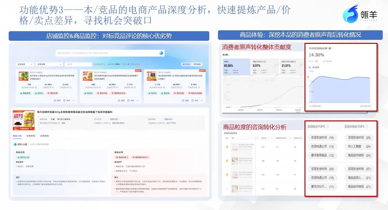 本竞品深度对标:系统支持店铺级与商品级的全方位对比分析。品牌可以清晰地看到自家产品与竞品在核心指标上的差异,自动提炼竞品的优势卖点与劣势槽点,从而找到市场的破局机会,制定差异化的竞争策略。