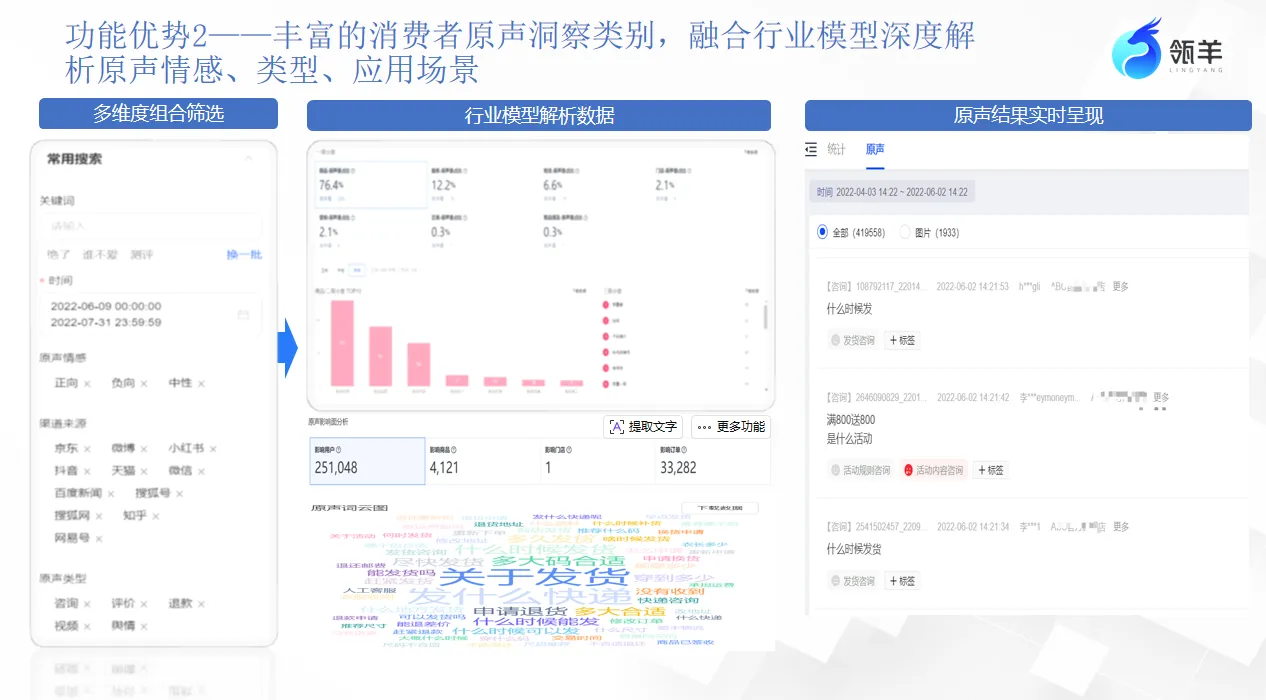 全渠道覆盖:系统能够无缝对接淘系(天猫/淘宝)、京东、拼多多、抖音、唯品会等主流电商平台,并兼容微博、小红书等社交媒体阵地。这意味着,无论是商品详情页的评价、客服的沟通记录,还是社交平台上的用户讨论,都能被纳入统一的分析框架。