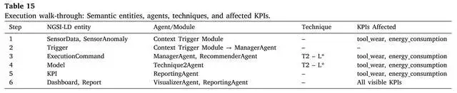 这些 KPI 在 agent 执行前后均会计算,从而能够清晰量化优化效果。Table 16 展示了各项技术与其主要影响的 KPI 之间的映射关系。所有评估输出均以语义化方式记录并存储在第 3.4 节定义的数据层中。这确保了优化结果具有可解释性、可审计性,并能无缝集成到外部分析 pipeline 或 digital twin 仪表板中。
