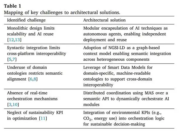 综上所述,这些挑战凸显了对模块化架构的迫切需求:此类架构应采用 NGSI-LD 等语义标准,利用 Smart Data Models 等经过精心策划的本体,通过 MAS 实现分布式协同,并将可持续性 KPI 融入决策流程。表 1 总结了上述局限性,并阐述了我们提出的架构如何通过语义建模、模块化 AI 封装以及基于代理的编排式协同来逐一应对这些问题。