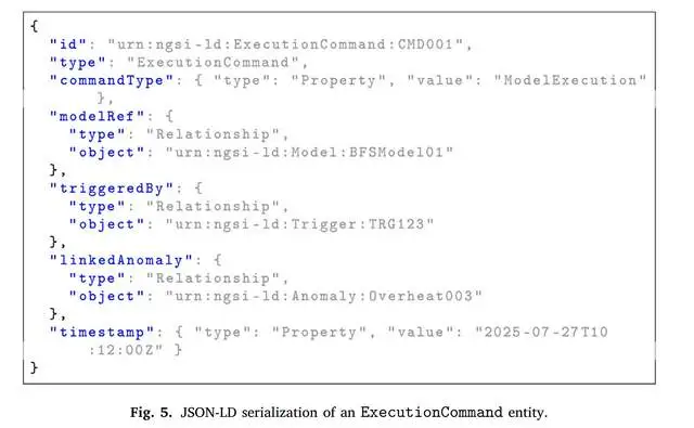 我们并未将物理定律或手工构建的逻辑嵌入系统,而是依赖于基于 NGSI-LD 和 Smart Data Models 的语义层。这一选择不仅仅是技术层面的考量,它源于一种更广泛的设计理念,该理念优先考虑模块化、适应性和跨域兼容性。正如 Bauer所强调的,语义分层支持 IoT 生态系统中可扩展且可复用的架构。Pereira进一步强调了其在实现轻量级且符合标准的集成方面的实际作用,这对于中小企业 (SMEs) 尤为重要,因为它们往往缺乏复杂模型开发所需的资源。
