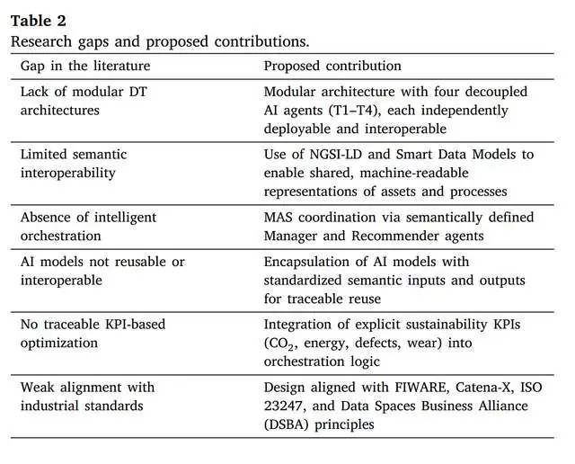 本工作为智能、可互操作的DT开发带来了多项创新贡献。技术层面,我们提出了一种分层且模块化的架构,其中AI技术被封装为具有标准化、语义对齐接口的自主代理。语义层面,采用NGSI-LD和来自Smart Data Models的精选本体,确保了跨异构资产和流程的一致集成。组织层面,系统利用MAS通过Manager和Recommender等代理角色来协调去中心化的AI行为。最后,我们的架构将可追溯的环境KPI(如CO2、energy、waste、wear)直接嵌入编排逻辑中,使DT性能与Industry 5.0可持续发展目标保持一致。这些贡献总结于Table 2中,该表将关键研究空白与本工作提出的架构策略进行了对应。