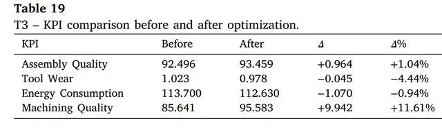 每个KPI的选择都因其体现了操作行为的相关方面。Machining Quality监控零件与计划设计的符合精度,因此构成了更好流程控制的最直接信号。Tool Wear与执行的平稳性直接相关。较低的tool wear不仅意味着更好的设备维护,还意味着因维护导致的停机更少。energyConsumption虽有小幅下降,乍看之下似乎微不足道,但当投射到数千个生产周期时,效率的累积提升便显现出重要性。Assembly Quality最终提供了系统层面的视角:如果前期阶段执行更加一致,后续环节出现的问题就会更少。