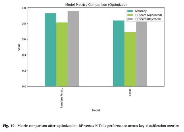 图19展示了分类指标的比较分析。虽然RF在两个结果类别上都达到了更高的准确率(超过90%)和平衡的F1分数,但K-Tails模型因其可解释性以及在检测"拒绝"实例方面的强精确度而脱颖而出。这说明了符号学习如何在拒绝关键应用中增强性能,在这些应用中,可解释性与数值准确性同样重要。