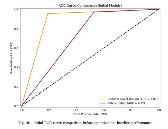 两种模型的判别能力在图20和图21中进一步说明。优化后,曲线下面积(AUC)值显著提升,RF从0.88升至0.97,K-Tails从0.72升至0.89。这些结果证实,混合化过程不仅提高了原始分类能力,还增强了对非可持续过程特征的早期检测。