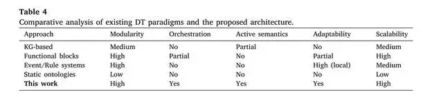 如表 4 所示,我们的架构融合了功能块设计的模块化清晰性、知识图谱的语义丰富性,以及规则和事件驱动自动化的响应能力 ,同时克服了基于静态本体模型的僵化性。其显著特征在于将高度模块化、主动语义和编排式决策制定相结合的方式,这使得分布式代理能够基于共享含义进行推理并实时行动。这种综合使 DT 能够从描述性框架演变为可操作的自适应系统,能够在真实工业场景中支持加工、装配和检测环节的弹性与可扩展性能。