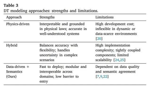为了更好地理解我们的框架与其他建模策略的对比,表3概述了物理驱动、混合以及我们的数据驱动结合语义方法的主要优势和局限性。这一对比有助于阐明为何灵活且可互操作的架构特别适合动态的真实工业环境。