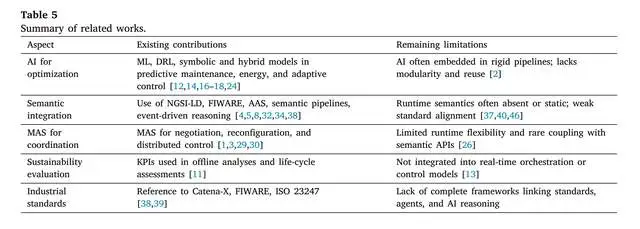 为了整合文献中的这些见解,表5提炼了这些观察结果,沿五个维度定位了主要贡献和反复出现的不足:AI优化、语义、MAS协调、可持续性以及标准合规性。模式显而易见:强大的构建模块确实存在,但大多数提案仍未能融合成具有凝聚力、模块化且真正具备运行时推理和适应能力的DTs框架。