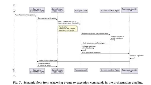位于编排(orchestration)与优化(optimization)之间,Context-Aware Trigger Module 在生命周期管理中发挥着至关重要的作用。它利用存储在 Data Space 中的模型相关元数据(如版本信息和重新训练状态),来评估是否需要对 AI 模型进行重新执行、替换或重新训练。这一机制确保优化层始终保持与上下文的相关性,并能响应不断变化的运营需求。