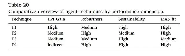 表 20 整合了这些观察结果,从 KPI 影响、操作噪声下的鲁棒性、可持续性贡献以及在 MAS 中集成的适用性等角度评估每种技术。