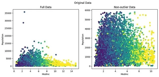下面用 scikit-learn 内置的 California 住房数据集来逐一演示。选取"Median Income"和"Population"两个量级差异明显的特征: