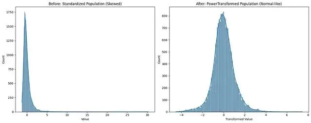 PowerTransformer 的做法是压缩分布的长尾,将异常值拉近数据主体,从而把偏斜分布整形为接近钟形曲线的形状。异常值的信息得以保留,但它们不再以极端的数值扭曲模型。Scikit-learn 中除了 PowerTransformer,QuantileTransformer 也能达到类似效果。