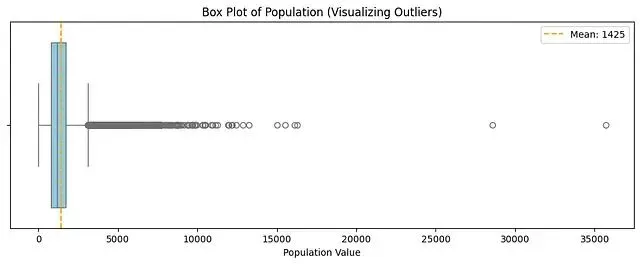 箱体对应的是数据主体(四分位距范围),右侧那一长串散点就是可能"掀翻跷跷板"的极端 Population 值。