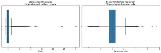 再看变换前后的箱线图:标准化后的数据主体仍然偏左,长尾向右延伸;PowerTransformer 处理后,箱体居中,两侧须线基本对称。