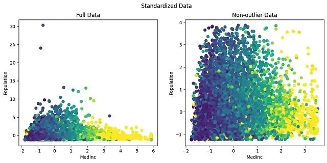 从图中可以看到,两个特征的主体数据落在了相近的区间:MedInc 在 [-2,5],Population 在 [-2,6]。
