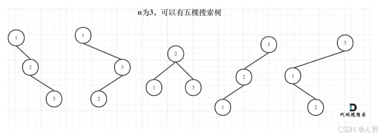 n,求恰由n个节点组成且节点值从1到n互不相同的 二叉搜索树 有多少种?返回满足题意的二叉搜索树的种数。示例 1: