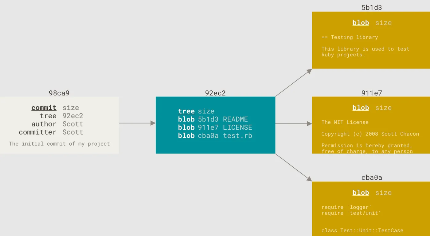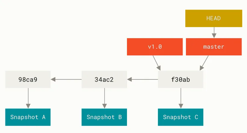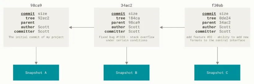 当你进行commit提交时,你会创建一个提交对象,而这个提交对象里面存储的是提交者的姓名、邮箱、提交时携带的信息、以及指向父节点的指针。