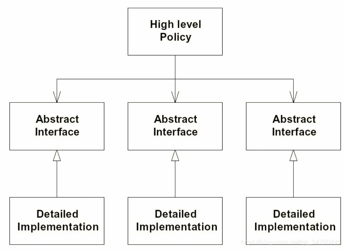 高层模块不应依赖低层模块,两者都应依赖抽象(接口);抽象不应依赖细节,细节应依赖抽象。