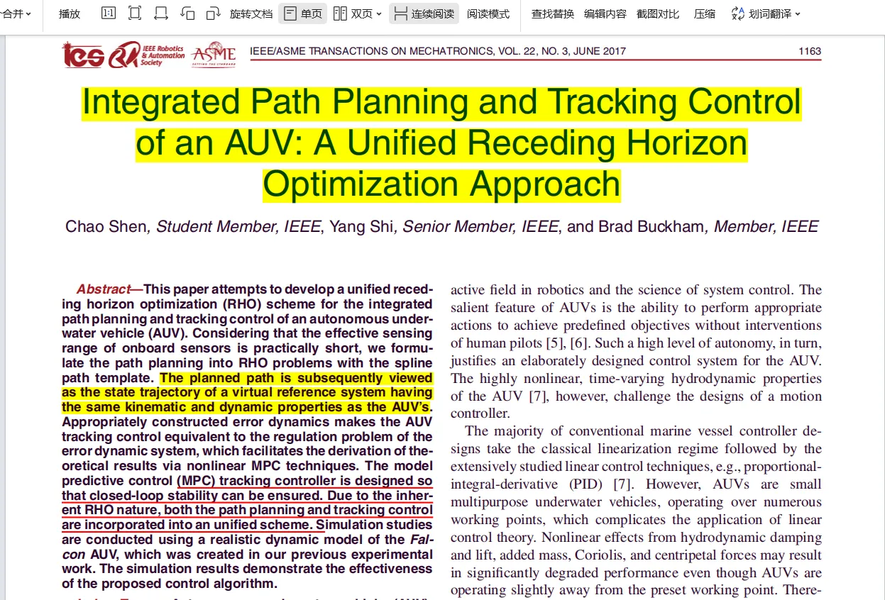 - 优势与挑战:MPC 应用于 AUV 路径跟踪具有诸多优势。它能够处理多变量、时变和约束系统,有效应对水下环境的复杂性和 AUV 运动的非线性特性。通过滚动优化,MPC 可以实时适应环境变化和模型不确定性。然而,MPC 也面临一些挑战,如模型准确性问题,水下环境复杂,精确建立 AUV 水动力学模型困难,模型误差可能影响路径跟踪效果;计算负担较大,每次采样都需求解优化问题,对 AUV 硬件计算能力要求较高。