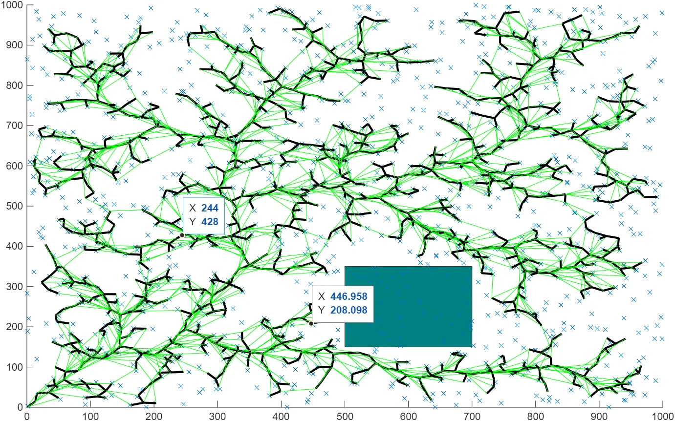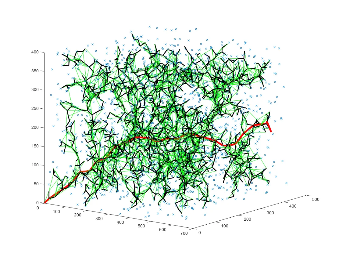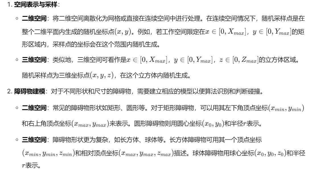- 三维空间:对于长方体障碍物,判断线段与长方体六个面所在平面是否相交;对于球体障碍物,同样计算线段到球心的最短距离与半径比较。如果检测到碰撞,则放弃该扩展,继续下一次采样和扩展尝试;若未碰撞,则将新节点添加到树中。