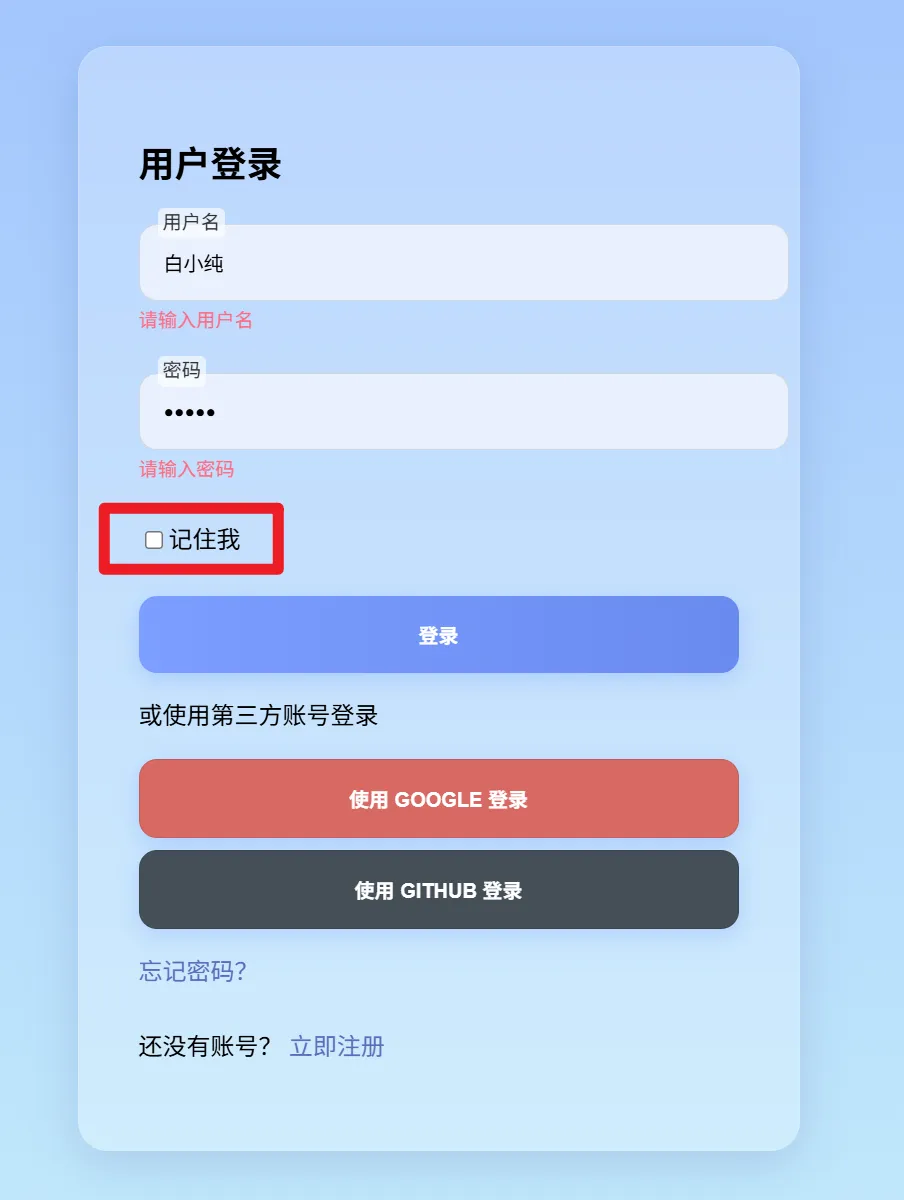 当用户勾选 “记住我” 时,服务器会生成一个长期有效的认证凭证,cookie的过期时间会设置的远些。