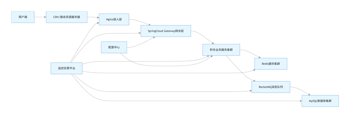 - 瞬时流量洪峰:秒杀开启瞬间,QPS可能从日常几百飙升至数十万甚至百万级,常规架构会被直接打穿