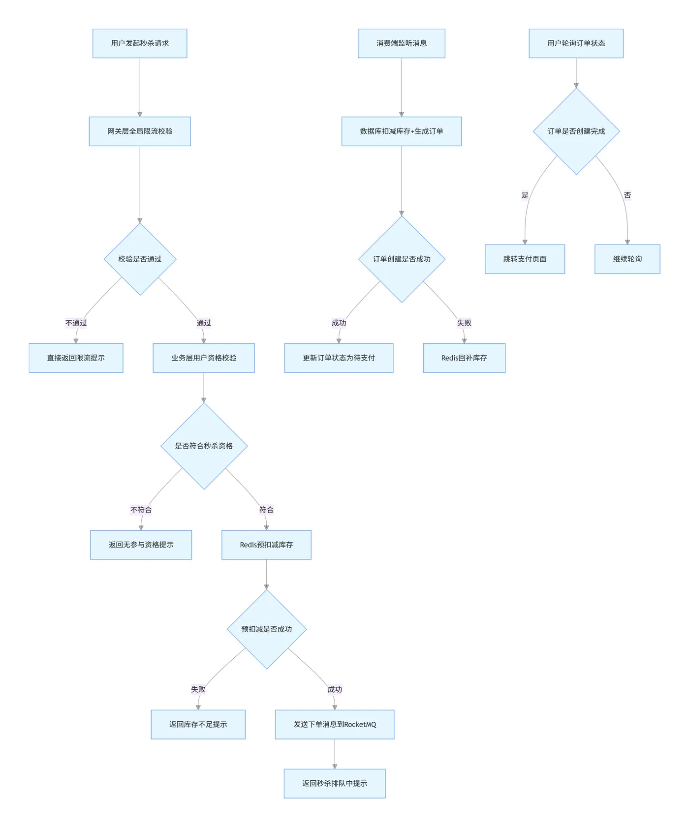- 资格校验全前置:将用户登录校验、活动时间校验、参与资格校验、重复下单校验全部放在业务逻辑最前端,不符合条件的请求直接返回,不执行后续逻辑