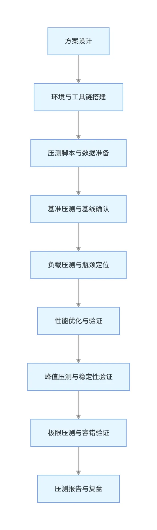 | 单系统压测 | 验证单个服务的承载能力 | 单个服务迭代后的性能回归 | 无法覆盖依赖服务的瓶颈,与线上真实场景脱节 |