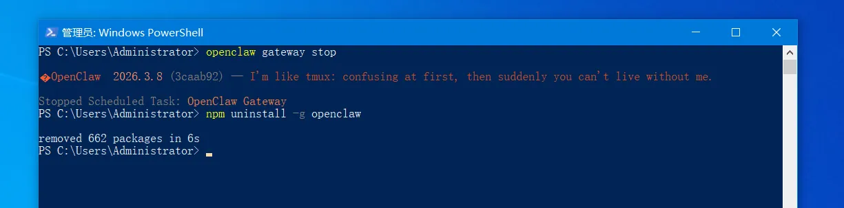 这里就提示OpenClaw 也成功卸载了, 662个包已移除,现在只需要删除残留配置就彻底干净了!
