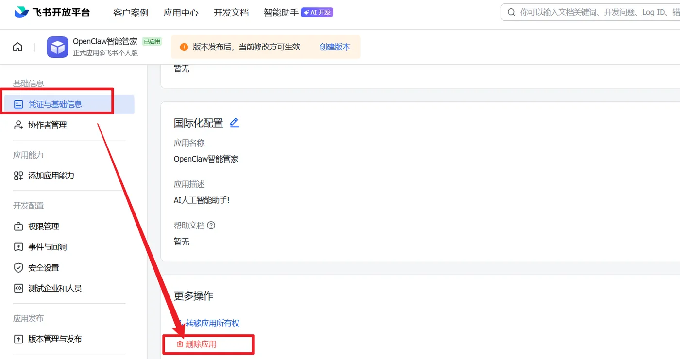 因为我们之前对接了飞书机器人,为了安全起见,我们也要把飞书上面的配置都删除掉~