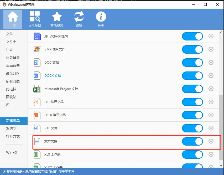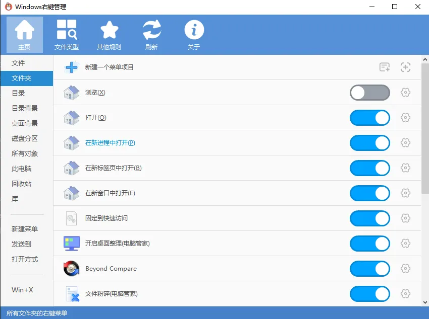 这款工具支持的右键菜单类型挺全的,包括文件/文件夹、目录背景、桌面背景、磁盘分区、所有对象、此电脑、回收站图标、库、新建菜单、发送到、打开方式等等。