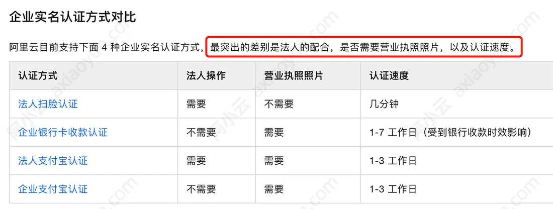 法人扫脸认证:需要法人操作,不需要营业执照照片,认证速度几分钟即可完成。法人扫脸实名认证教程:https://help.aliyun.com/zh/account/legal-person-biometric-verification