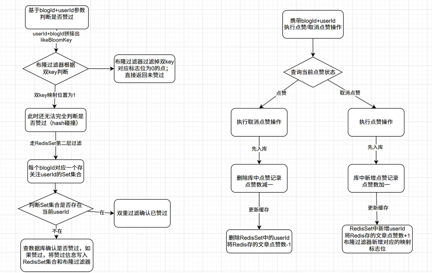 /** * 判断是否点赞(核心:Redis优先) * @param blogId * @return */ public Boolean isLiked(Long blogId) { Long userId = UserUtil.getUserId(); String likeBloomKey = userId + ":" + blogId; // 1. 布隆过滤器第一层过滤:一定不存在直接返回false if (!bloomFilterHelper.contains(stringRedisTemplate, RedisKeyConstant.BLOOM_FILTER_LIKE_KEY, likeBloomKey)) { return false; } // 2. Redis Set第二层过滤:存在则返回true String likeSetKey = String.format(RedisKeyConstant.BLOG_LIKE_SET_KEY, blogId); Boolean isMember = stringRedisTemplate.opsForSet().isMember(likeSetKey, userId.toString()); if (Boolean.TRUE.equals(isMember)) { return true; } // 3. MySQL兜底查询(极少走到这一步) Boolean flag = blogMapper.isLiked(userId, blogId); // 补偿写入Redis:避免下次再查MySQL if (Boolean.TRUE.equals(flag)) { stringRedisTemplate.opsForSet().add(likeSetKey, userId.toString()); bloomFilterHelper.add(stringRedisTemplate, RedisKeyConstant.BLOOM_FILTER_LIKE_KEY, likeBloomKey); } return flag; } // ====================== 点赞/取消点赞(核心:先更库,再更缓存) ====================== @Transactional(rollbackFor = Exception.class) public Boolean like(Long blogId) { Long userId = UserUtil.getUserId(); String likeBloomKey = userId + ":" + blogId; String likeSetKey = String.format(RedisKeyConstant.BLOG_LIKE_SET_KEY, blogId); String likeCountKey = String.format(RedisKeyConstant.BLOG_LIKE_COUNT_KEY, blogId); // 1. 查询当前点赞状态 Boolean isLiked = isLiked(blogId); Boolean result1 = false; Boolean result2 = false; if (isLiked) { // 2. 取消点赞:先更库 result1 = blogMapper.unlike(blogId); result2 = blogMapper.deleteLike(blogId, userId); if (result1 && result2) { // 3. 再更缓存:删除Set中的用户ID + 递减点赞数 stringRedisTemplate.opsForSet().remove(likeSetKey, userId.toString()); stringRedisTemplate.opsForValue().decrement(likeCountKey); } } else { // 2. 点赞:先更库 result1 = blogMapper.like(blogId); result2 = blogMapper.addLike(blogId, userId); if (result1 && result2) { // 3. 再更缓存:添加Set + 递增点赞数 + 更新布隆 stringRedisTemplate.opsForSet().add(likeSetKey, userId.toString()); stringRedisTemplate.opsForValue().increment(likeCountKey); bloomFilterHelper.add(stringRedisTemplate, RedisKeyConstant.BLOOM_FILTER_LIKE_KEY, likeBloomKey); } } return result1 && result2; } // ====================== 查询帖子点赞数(核心:Redis优先) ====================== public Integer getLikedCount(Long blogId) { String likeCountKey = String.format(RedisKeyConstant.BLOG_LIKE_COUNT_KEY, blogId); // 1. 先查Redis String countStr = stringRedisTemplate.opsForValue().get(likeCountKey); if (countStr != null) { return Integer.parseInt(countStr); } // 2. Redis未命中,查MySQL兜底 Integer count = blogMapper.getLikedCount(blogId); if (count == null) { count = 0; } // 3. 补偿写入Redis stringRedisTemplate.opsForValue().set(likeCountKey, count.toString()); return count; }