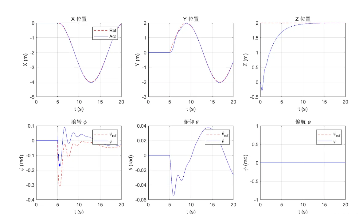 - 优势与效果:基于增量 PID 的控制策略结合四旋翼无人机的离散化建模,能够较好地应对无人机系统的非线性和强耦合特性。离散化建模为增量 PID 控制器提供了适合数字处理的系统模型,而增量 PID 控制器能够根据实时误差快速调整控制输入,有效抑制外界干扰对轨迹跟踪的影响,实现较为精确的轨迹跟踪效果。同时,增量 PID 算法相对简单,计算量小,适合在无人机搭载的有限计算资源平台上运行,保证了控制的实时性。